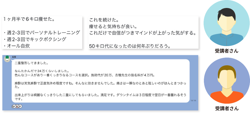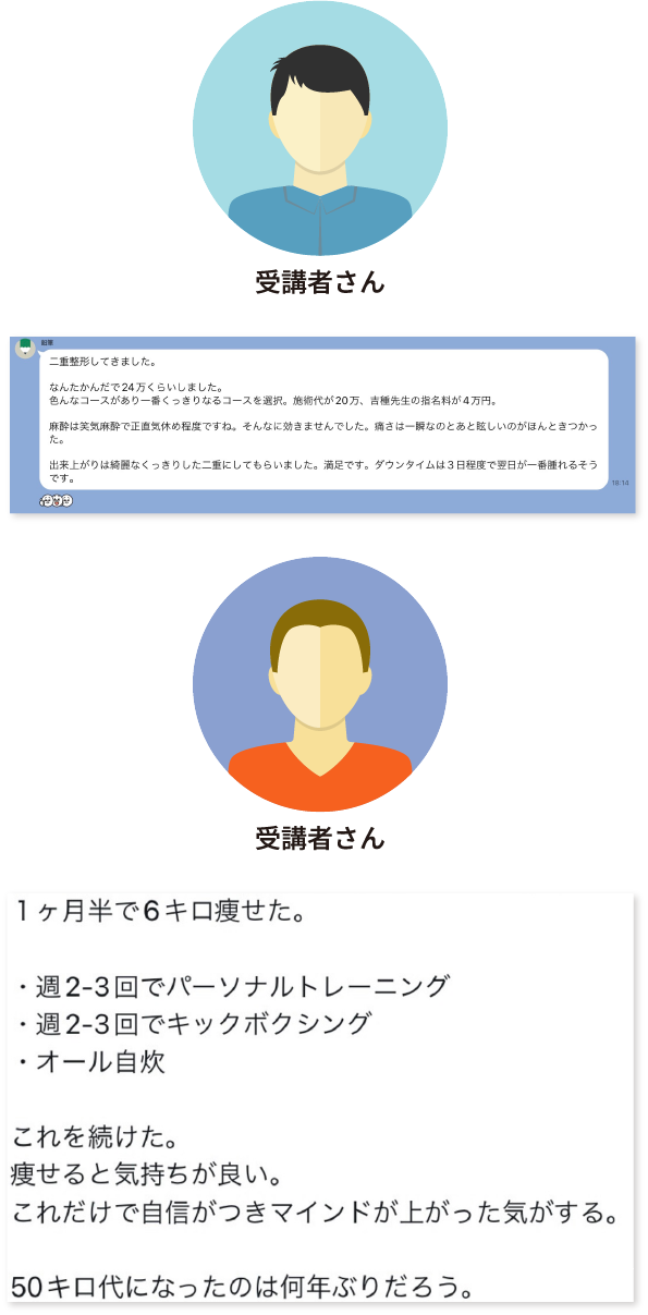 ビジネスをされていない方でも1から指導いたします。同じように恋愛コンサルを始める方、パーソナルトレーナーになり筋トレの指導をする方など内容は千差万別ですが、SNSを活用してリストを集めて教育するという点は共通しておりますのでどんなビジネスを始める方でもご安心ください。そして、1から始めた方でも成果は出ておりますので実績をご覧ください。