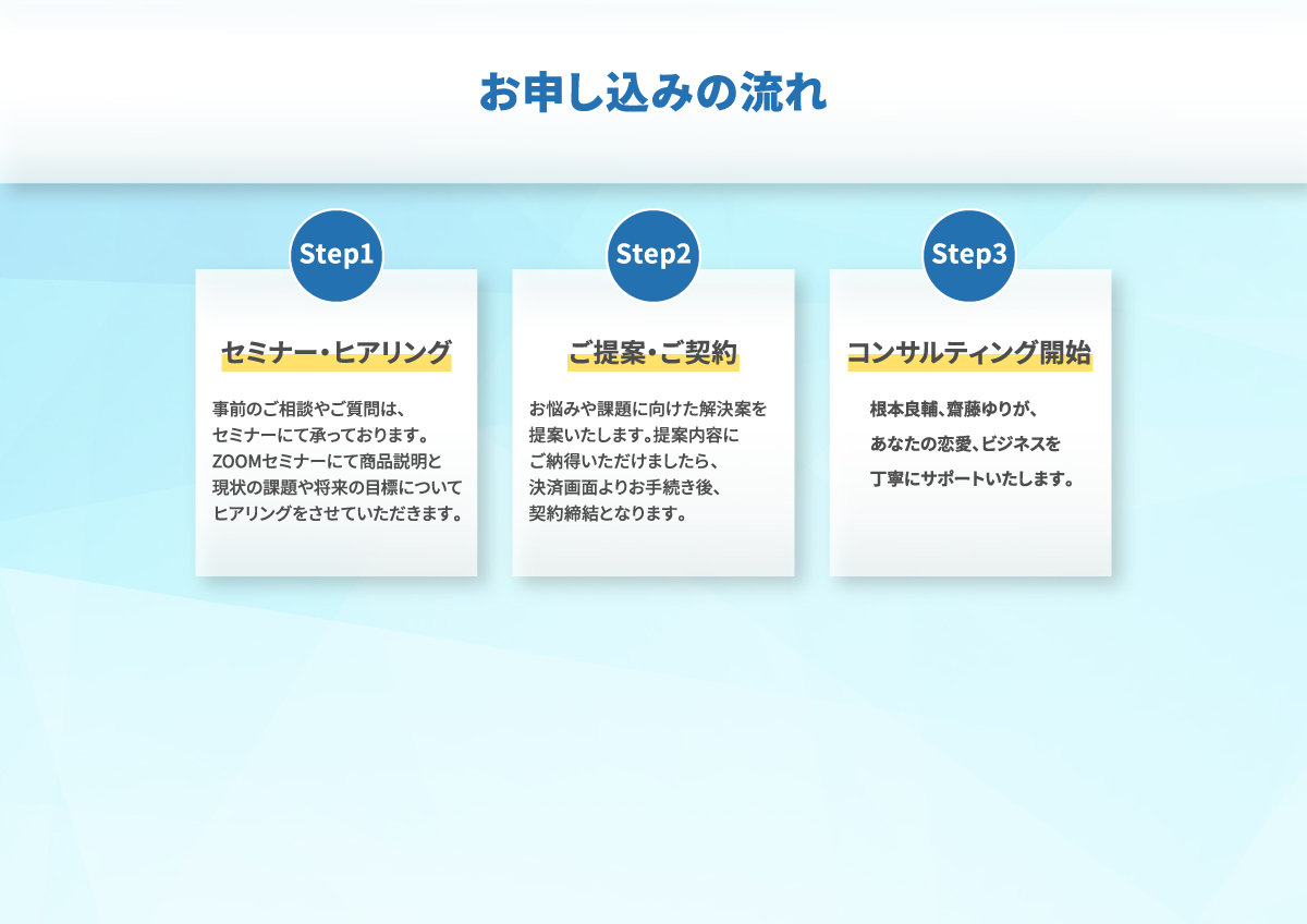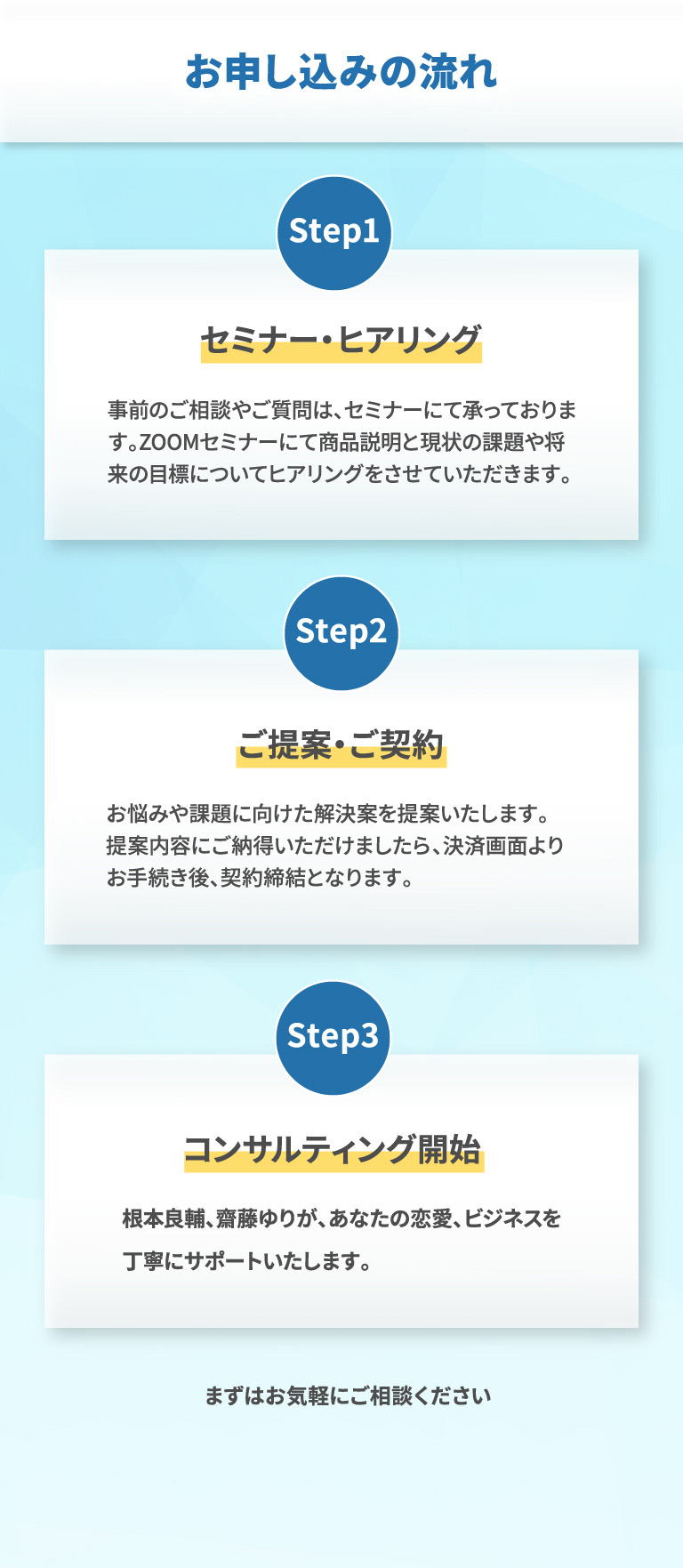 根本さんから恋愛を教わって2週間である程度恋愛で結果がでるようになりました。自信がついたので自分も恋愛講師として活動することになりました。根本さんにビジネスの基本の全て教えてもらえたので、すぐにお金を稼ぐことができるようになりました。根本さんのコンサルでは"恋愛力"と"自分能力で稼ぐ力"が身につくのでどんなビジネスコンサルよりもお勧めします。(Fさん、22歳)