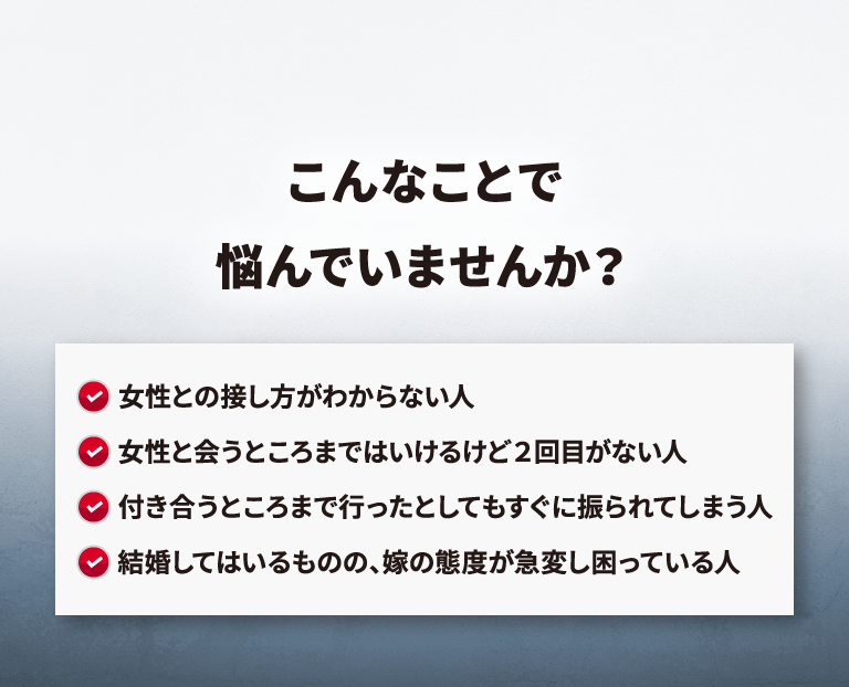 女性を知り、魅力を高めて(美容整形、筋トレ、ファッション改善、女性スタッフによるデートの実演練習)モテるようになり、長期的な関係性を築けるようになることを目的とする。